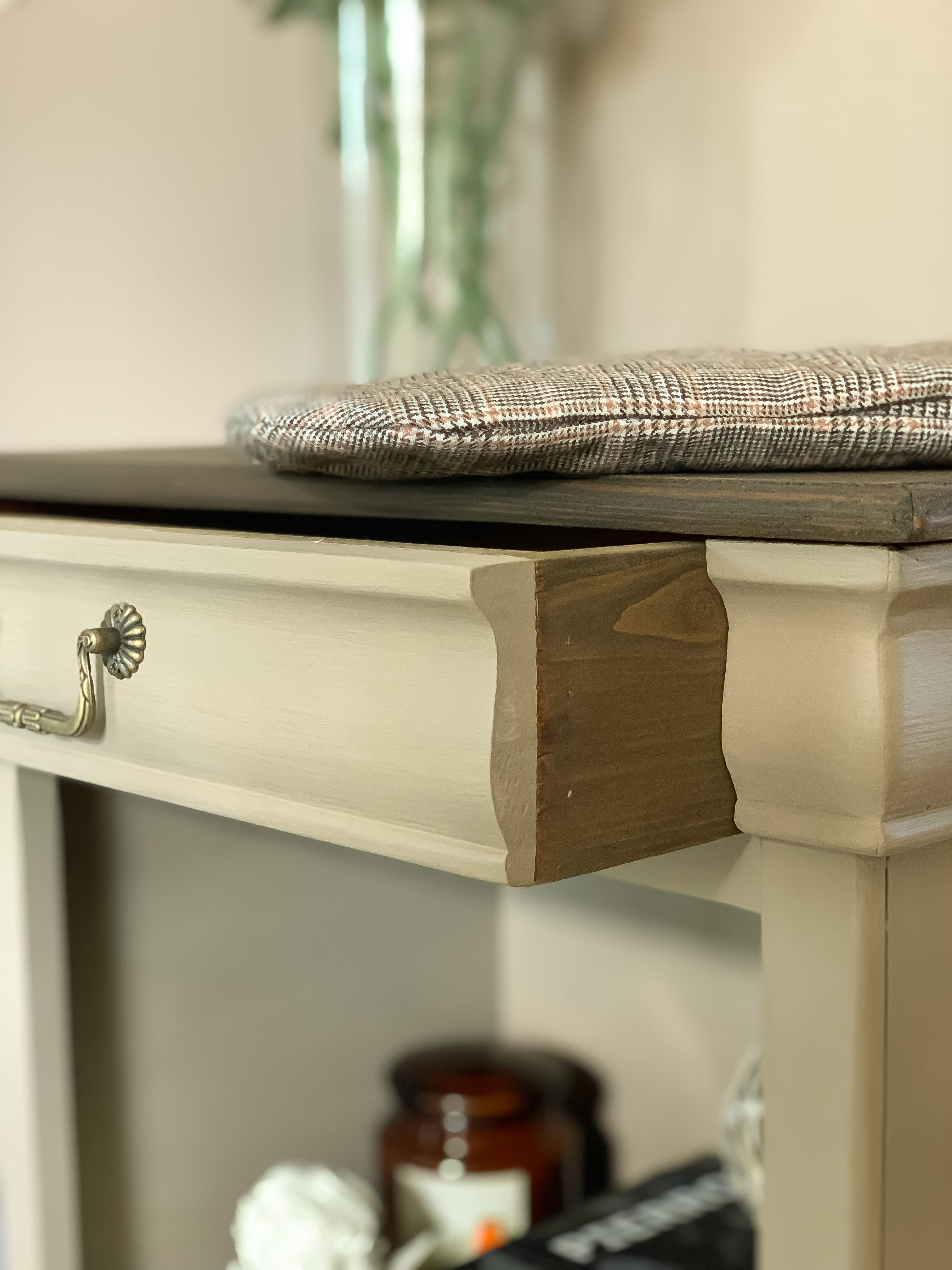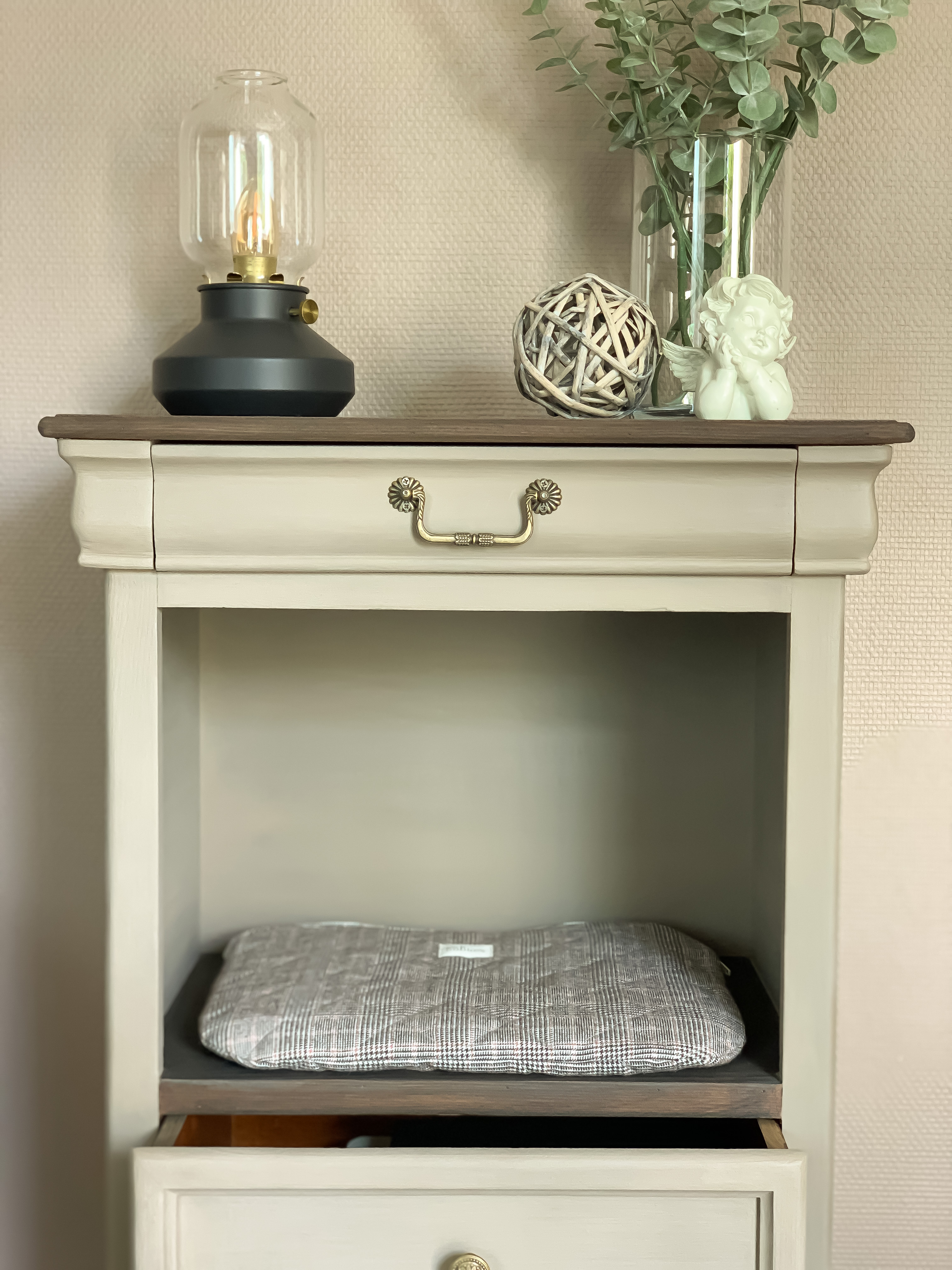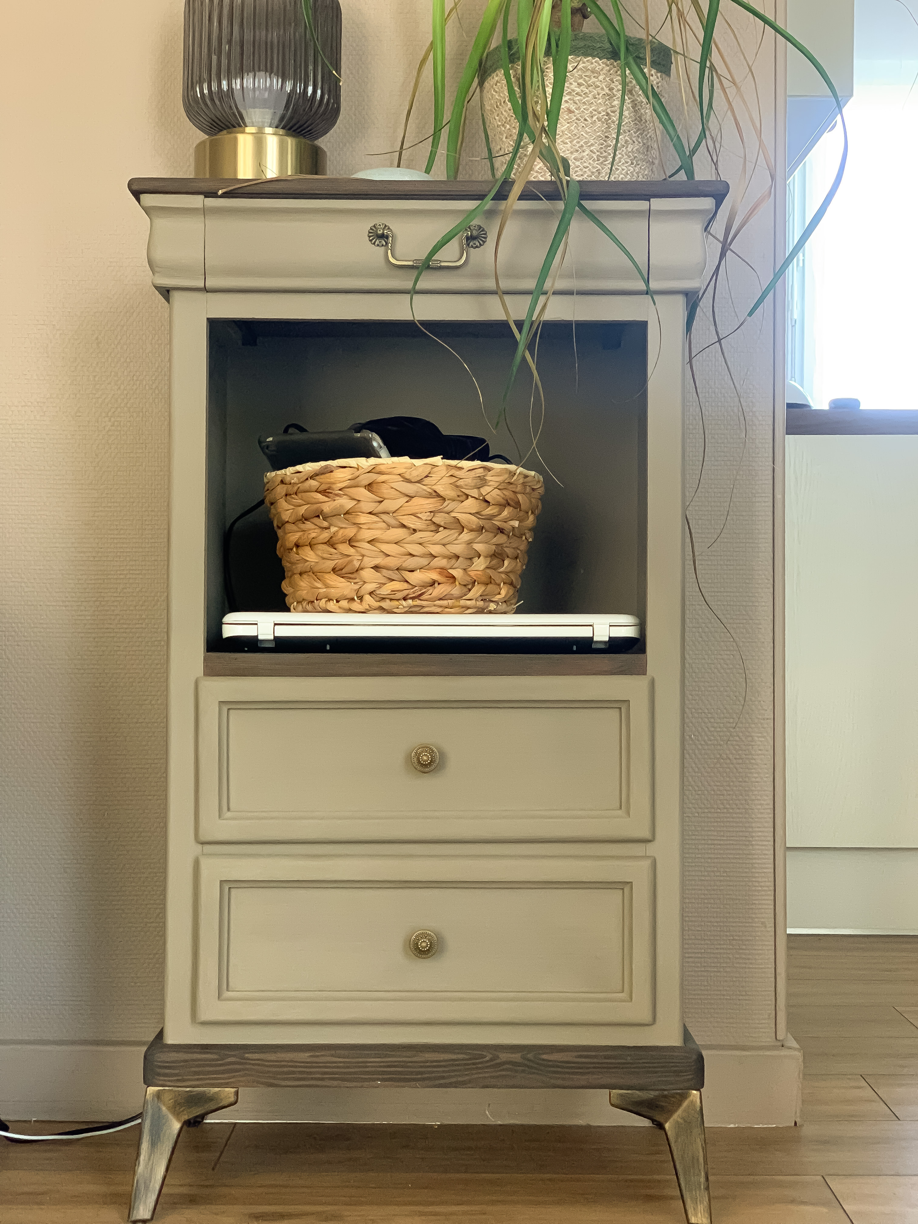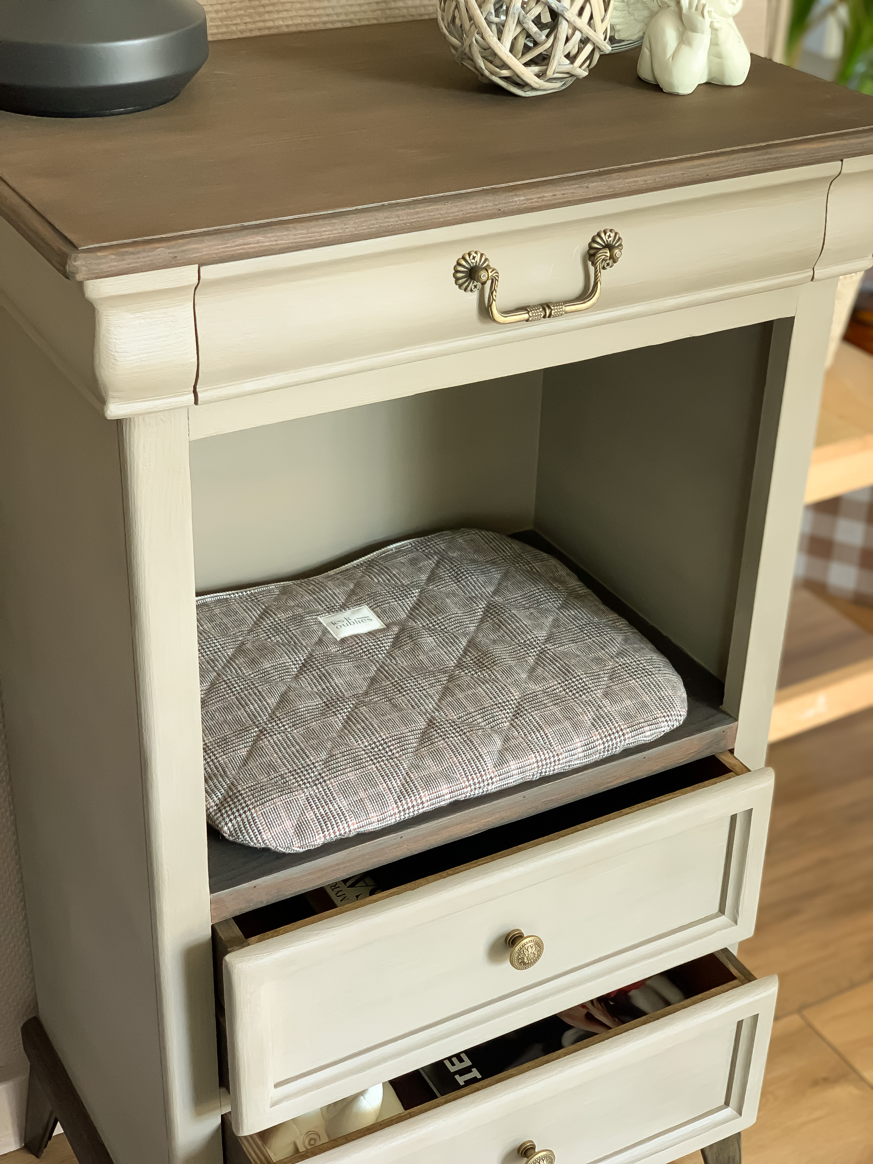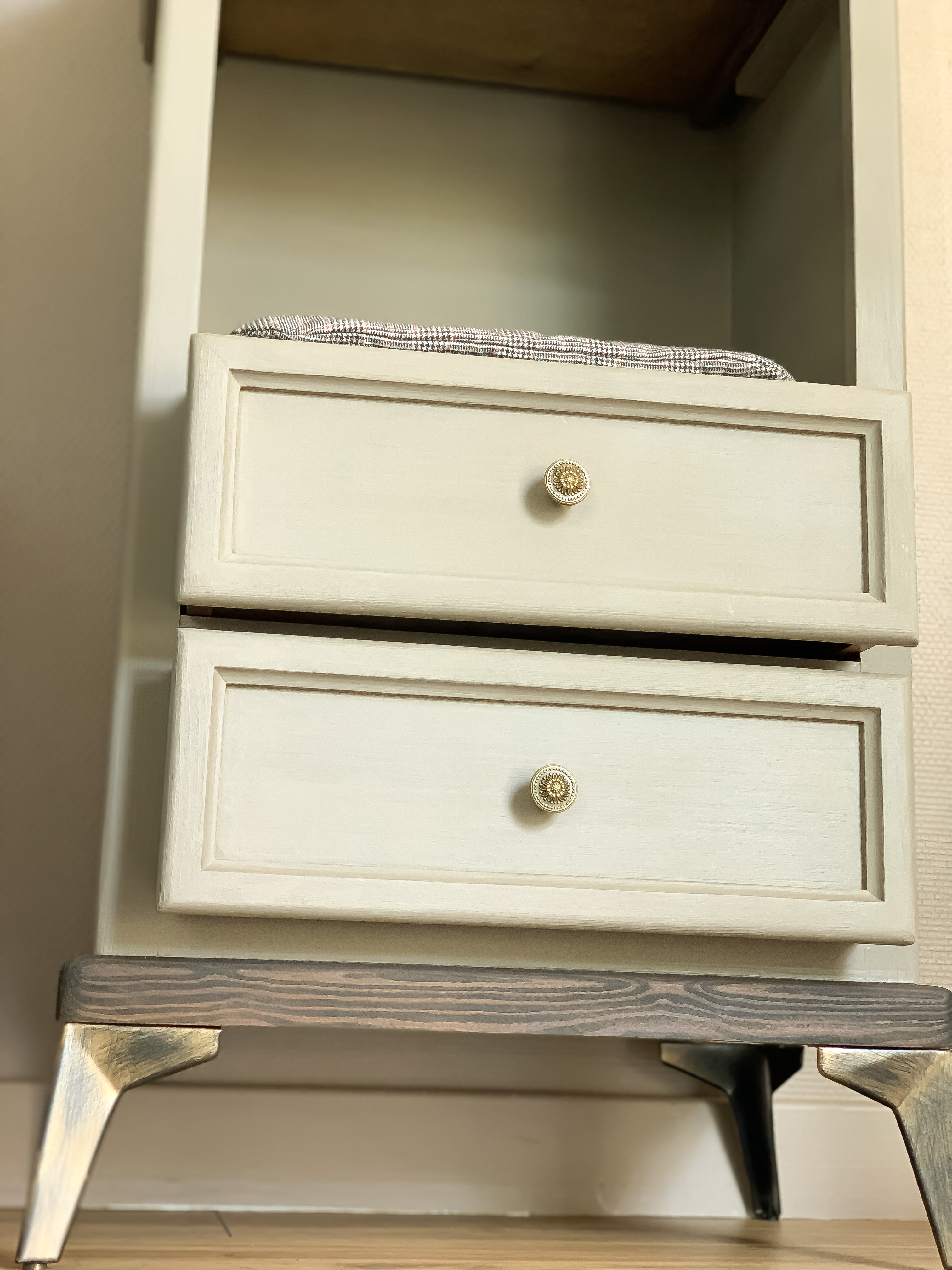 Les accessoires en laiton antique, viennent compléter l’ensemble avec une touche de sophistication discrète. Leur finition dorée légèrement vieillie confère au meuble un aspect légèrement rétro, mais aussi raffiné, soulignant l’authenticité et le soin apporté aux détails.